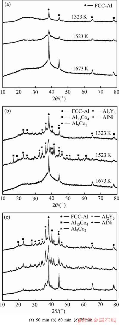 根据DSC曲线选择退火温度590 K(位于第一晶化峰值和第二晶化峰值之间),将3种熔体温度制备的铝基非晶薄带以10 K/min的升温速率分别加热到590 K,然后分别保温50、60和75 min,其结果如图5所示。由图5(a)可见,在保温50 min时,3种熔体温度制备的铝基非晶薄带均只有FCC-Al析出并且明显可以看出1673 K制备的非晶晶化程度更高,这与激活能计算结果相符合。由图5(b)可见,当退火至60 min时,在1323 K和1523 K制备的非晶薄带开始析出了Al2Y3、Al13Co4、Al9Co2和AlNi等脆性金属间化合物,而在1673 K制备的非晶薄带仍然只有FCC-Al析出。由图5(c)可见,退火至75 min时,3种熔体温度制备的非晶薄带均析出了金属间化合物,产物并无差别。这也表明熔体温度为1673 K制备的非晶薄带更难析出金属间化合物,很好地验证了激活能的计算结果。