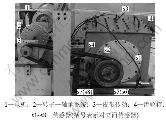 齿轮振动测试实验在美国SpectraQuest公司的机械故障综合模拟实验台上进行,该实验台可模拟机械设备常见故障,用于故障诊断研究。选用8个传感器对齿轮振动进行监测,实验台及传感器布置如图1所示。由于实验台齿轮箱的支承部位不便安装传感器,故8个传感均布置于齿轮箱外部,其中,s1~s4安装于齿轮箱体上,s5~s8安装于齿轮箱体基座的4个角端。采用奥地利Dewetron公司DEWE-16通道高精度测试系统及美国PCB608A11加速度传感器组成测试系统,采样频率为20 kHz。