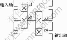 在实验过程中,由电机驱动转子-轴承系统通过皮带传动输入转速于齿轮箱,齿轮箱传递的全部动力由磁力制动器吸收。齿轮传动部分主要由2对啮合斜齿轮、输入轴、中间轴和输出轴等零部件组成,其传递机构如图2所示(其中,z为测试齿轮)。