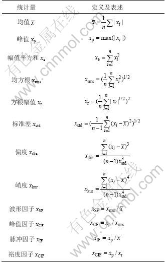 本文所用的12个时域统计量如表1所示[10-11]。表中xi(i=1, 2, …, n)为实验采集的时序信号。