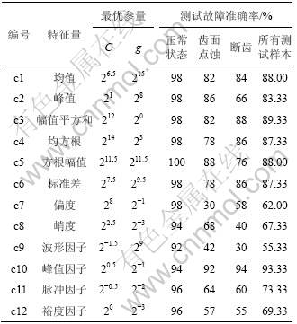 基于不同时域统计量与支持向量机的多传感器信息融合诊断结果如表2所示。总测试样本诊断精度可反映特征量对齿轮故障的敏感程度。从表2可见:峰值因子对齿轮故障最敏感,利用其组成特征向量,诊断准确率达93.33%,其次分别为幅值平方和、方根幅值、均值、均方根、标准差、峰值,诊断准确率均在80%以上,偏度、峭度、波形因子、裕度因子对齿轮故障敏感性较差,诊断准确率均在70%以下。