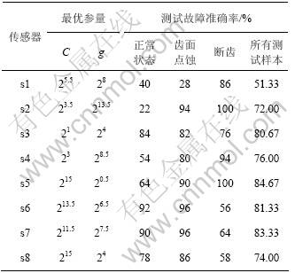 取单个传感器的8个时域统计量(表2中诊断精度高的前8个特征量)组成8维特征向量,构成数据样本。为避免不同特征量的数量级差别对SVM分类结果的影响,在SVM训练与测试前对特征向量进行归一化处理,测试结果表明归一化处理对诊断精度有明显影响。而多传感器信息融合中采用多个传感器的同一特征量作为特征向量,不存在数量级差别,无需归一化处理,故过程更简单。分别对8个传感器进行分析,诊断结果如表3所示。从表2和表3可以看出:多传感器信息融合诊断精度高于单个传感器诊断精度。各个传感器的诊断精度差异较大,这与传感器布置位置有关,此结果可为传感器优化布置提供依据。多传感器信息融合传感器布置覆及整个齿轮箱,其布置位置对诊断结果影响不大,诊断结果更可靠。
