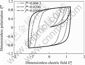 are applied on the ferroelectric. The frequencies equal 0.05, 0.02 and 0.006 3, respectively, and the cycle, τ*=1/f*, equals 20, 50 and 158. On the one hand, it can be seen from Fig.4 that the hysteresis loop becomes narrow with decreasing frequency. This indicates that the coercive field will decrease with frequency. And the values of the coercive fields are 1.15, 0.95 and 0.63, respectively. One reason for this could be that the polarization switched under a low field frequency experiences a period of time, while in the high frequency, there is not enough time to experience switching process, which leads to a high coercive field. On the other hand, there is no obvious difference in the remnant polarization in Fig.4. That may be caused by the range of the simulated frequency chosen to be too narrow, which leads to the remnant polarization of one frequency being little different from the other. The area of the hysteresis loop increases with the frequency. The area of the hysteresis loop is in direct proportion to the energy loss. This part of energy transforms into thermal energy, so hysteresis loop is usually measured in low frequency. LOHSE et al[3] have observed that the coercive field increases with the frequency in PZT thin films. We can see that the trend of the coercive field versus the frequency in our simulation agrees with the experimental results.
