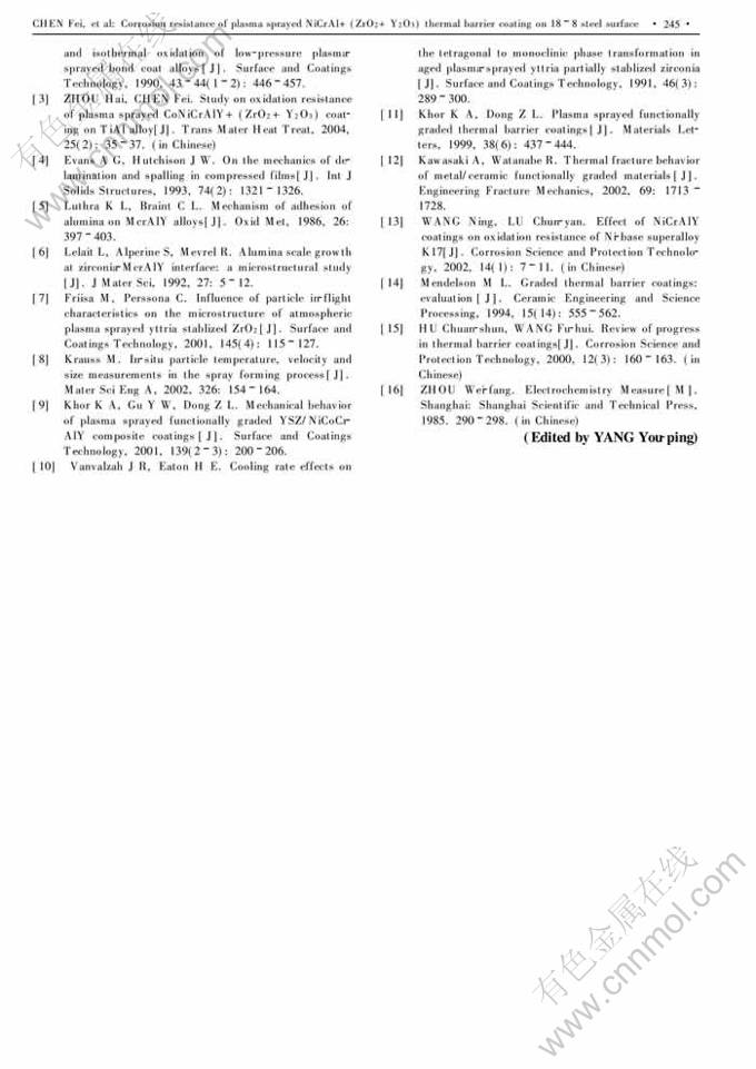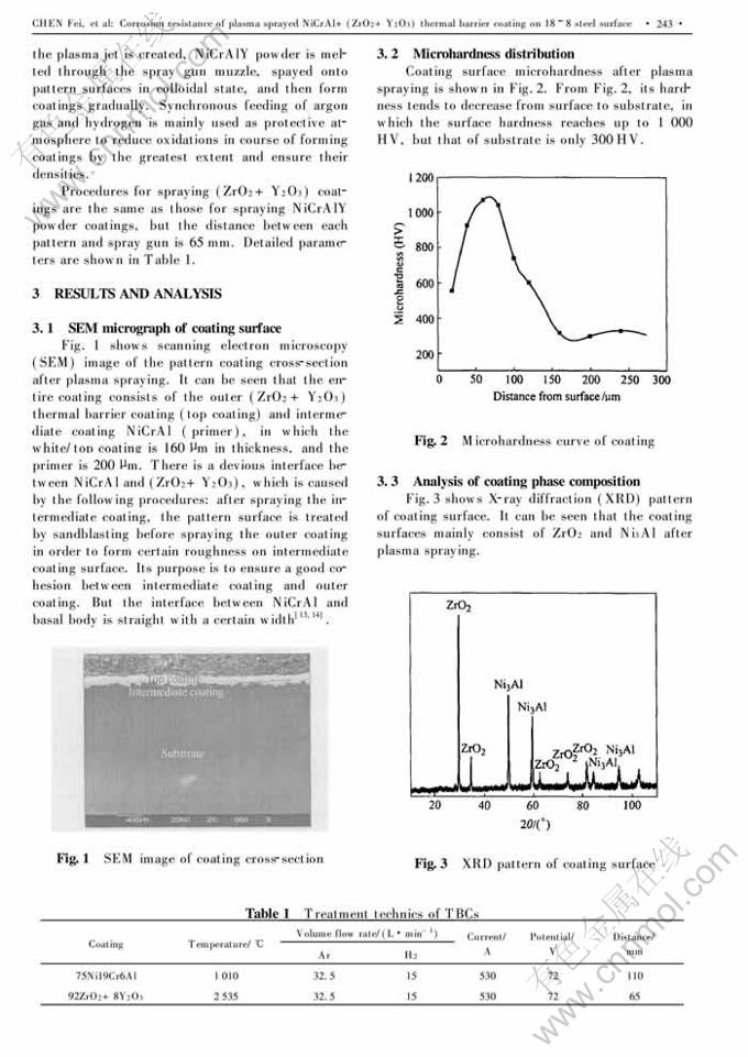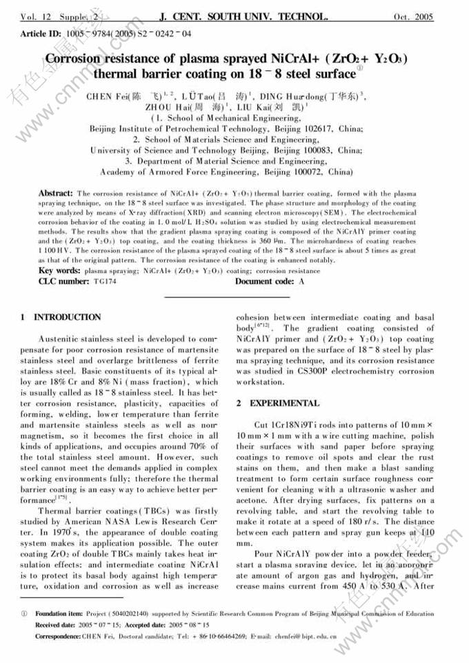 Key words:plasma spraying; NiCrAl+(ZrO2+Y2O3) coating; corrosion resistance