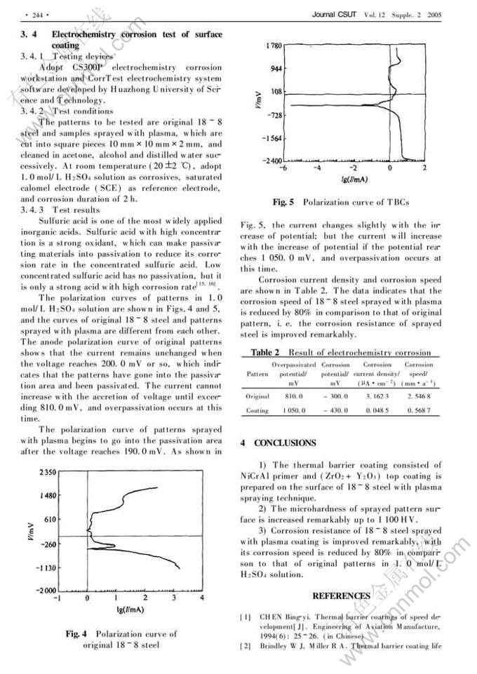 Abstract: The corrosion resistance of NiCrAl+(ZrO2+Y2O3)thermal barrier coating, formed with the plasma spraying technique, on the 18-8 steel surface was investigated. The phase structure and morphology of the coating were analyzed by means of X-ray diffraction(XRD) and scanning electron microscopy(SEM). The electrochemical corrosion behavior of the coating in 1.0mol/L H2SO4 solution was studied by using electrochemical measurement methods. The results show that the gradient plasma spraying coating is composed of the NiCrAlY primer coating and the (ZrO2+Y2O3 ) top coating, and the coating thickness is 360μm. The microhardness of coating reaches 1100HV. The corrosion resistance of the plasma sprayed coating of the 18-8 steel surface is about 5 times as great as that of the original pattern. The corrosion resistance of the coating is enhanced notably.