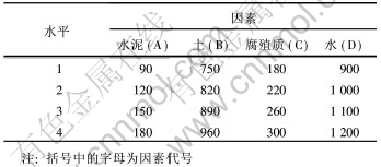 采用正交试验研究水泥、 土壤、 有机质与粗纤维的混合物和水4个因素对于基材的影响, 就每种因素拟考虑4个水平。 选取的正交试验表为L16(45), 不考虑各因素的交互作用, 即假定它们之间相互没有影响。 在种子能够发芽的基础上并考虑工程实际情况, 本试验采用的因素与对应的水平数如表1所示。