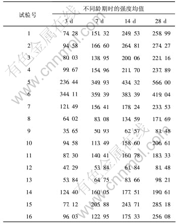 m腐殖质∶m水=1.00∶6.83∶1.50∶10.00; 龄期为7 d时, 应选取的基材最佳配比是A2B2C2D4, 即各因素的质量比为m水泥∶m土∶m腐殖质∶m水=1.00∶6.83∶1.83∶10.00; 龄期为14 d和28 d时, 应选取的基材最佳配比均是A2B2C2D3, 即各因素的质量比为m水泥∶m土∶m腐殖质∶m水=1.00∶6.83∶1.83∶9.17。 由此可见, 在要求基材有较高的早期强度的条件下, 应采取的混合基材配比方案为A2B2C1D4或A2B2C2D4; 若对基材的早期强度要求不高, 而对后期强度要求较高则采用的混合基材配比方案为A2B2C2D3。