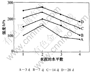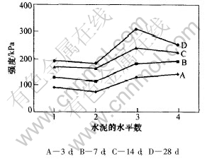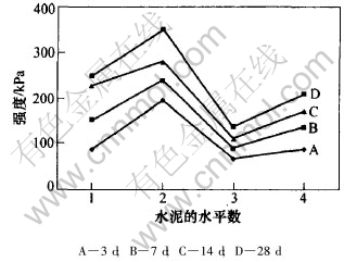 d. 并不是水泥含量越高, 基材的强度就越高, 而是在水泥的第2水平时基材的强度达到最大, 所以, 加大水泥含量并不一定能提高基材的强度。 其原因可能是随着水泥含量的增加, 基材中提供植被生长所需养分的腐殖质的含量增加, 而腐殖质是一种松散材料, 它的加入, 反而使基材的强度降低。