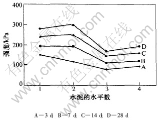 对试验所得的基材的不同龄期的无侧限抗压强度值进行正交试验的极差分析, 并画出各因素不同龄期时的水平影响趋势图, 水泥、 土、 腐殖质和水与基材无侧限抗压强度的关系图分别如图4~7所示。