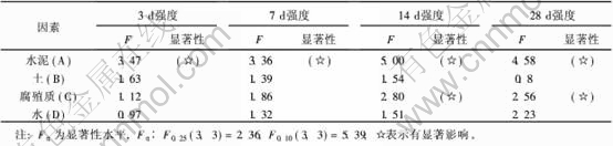 对基材不同龄期时的无侧限抗压强度值进行正交试验的方差分析, 分析结果如表3所示。
