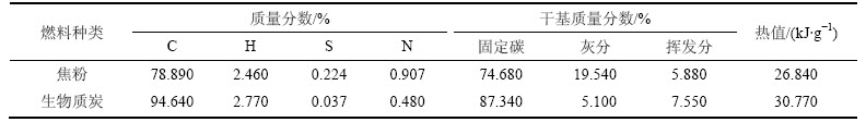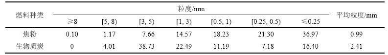 本研究采用的燃料为焦粉和生物质炭。其中生物质炭为木质炭,木质炭由可改良贫瘠土壤的人工薪炭林硬阔叶树木麻栎经炭化制成。燃料的化学成分及工业分析结果见表2,燃料灰分的化学组成见表3。由表2可知:焦粉的灰分较高,挥发分较低,生物质炭灰分较低,挥发分较高。生物质炭具有更高的固定碳质量分数,热值也比焦粉的高,而有害元素S和N质量分数比焦粉质量分数低很多。由表3可知:生物质炭的灰分中CaO质量分数较高,SiO2质量分数较低,表现为碱性,而焦粉呈酸性。燃料的粒度组成见表4,密度、吸水性等物理性能见表5。由表4和表5可知:生物质炭的平均粒度比焦粉的大,且粒度为0.5 mm的生物炭质质量分数比焦粉的低;与焦粉相比,生物质炭的密度较低,吸水性比焦粉强,其最大分子水和最大毛细水均比焦粉的大。