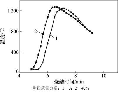 在褐铁矿质量分数为50%时,研究生物质炭替代焦粉对料层温度的影响。烧结料面下100 mm处料层的温度变化如图3所示。从图3可知:当生物质炭替代焦粉的质量分数达到40%时,与完全采用焦粉时相比,料面下100 mm处最高温度由1 250 ℃提高到 1 272 ℃,达到最高温度的时间由7.33 min提前到6.50 min,升温速率(即100 ℃升高到最高温的平均速率)由11.30 ℃/s提高到12.90 ℃/s。