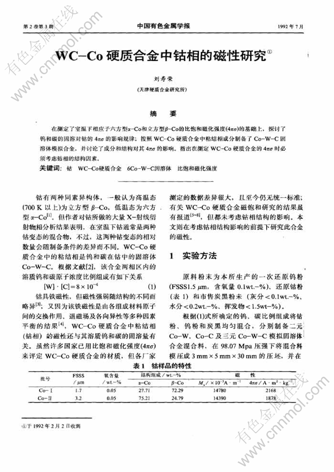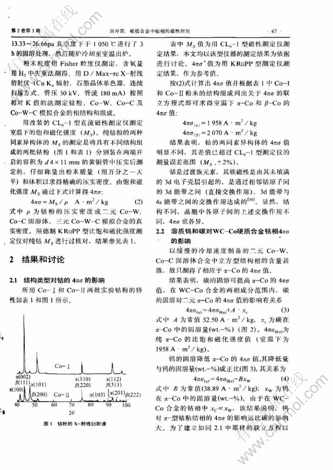 关键词:钴 WC—Co 硬质合金 6Co—W—C 固溶体 比饱和磁化强度