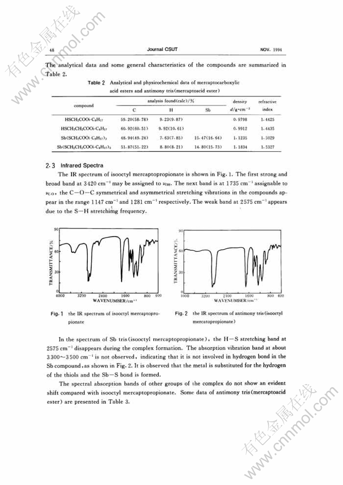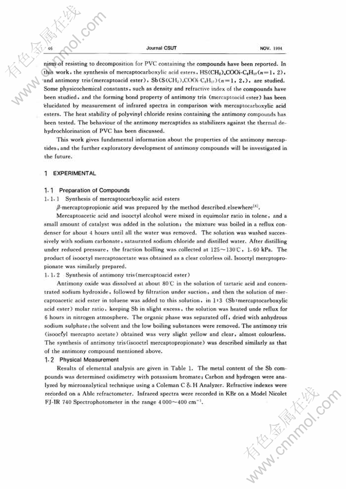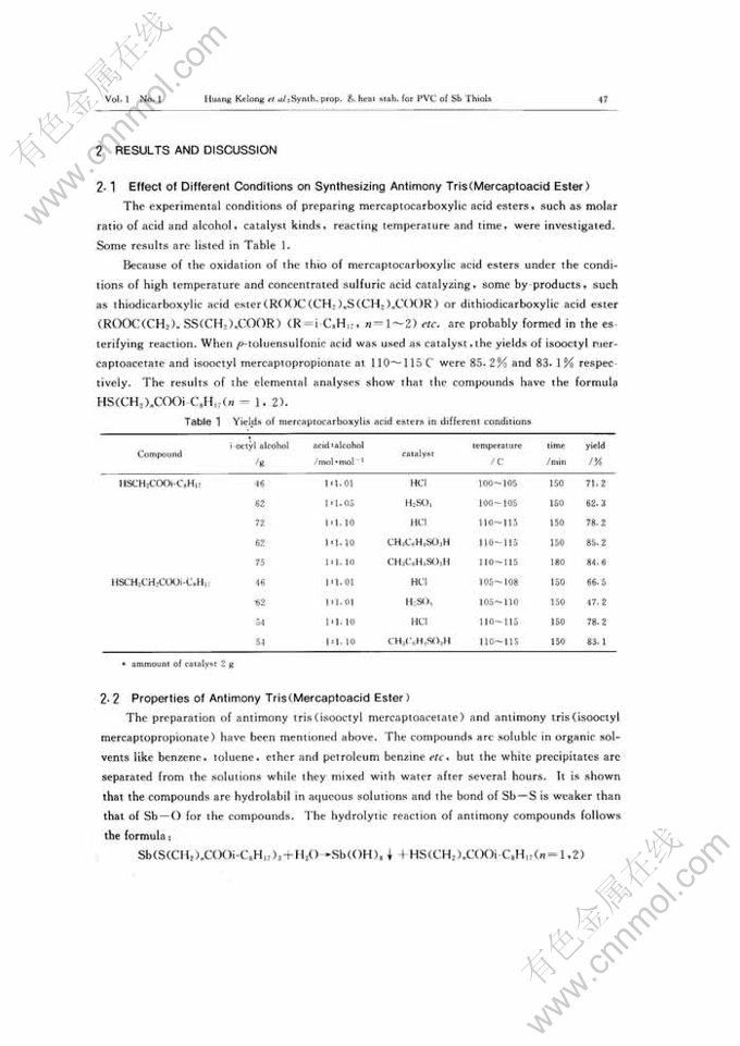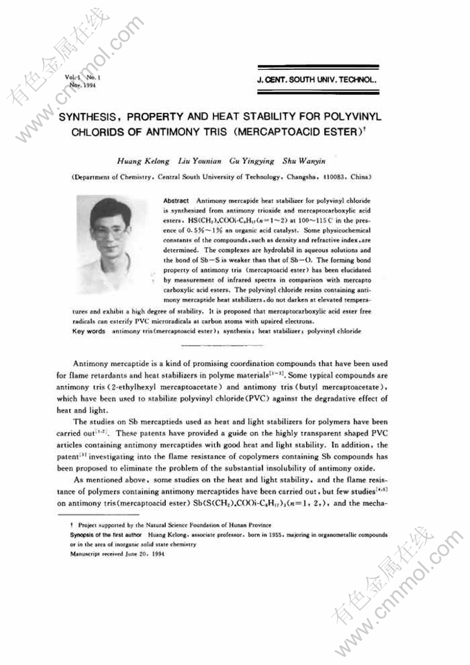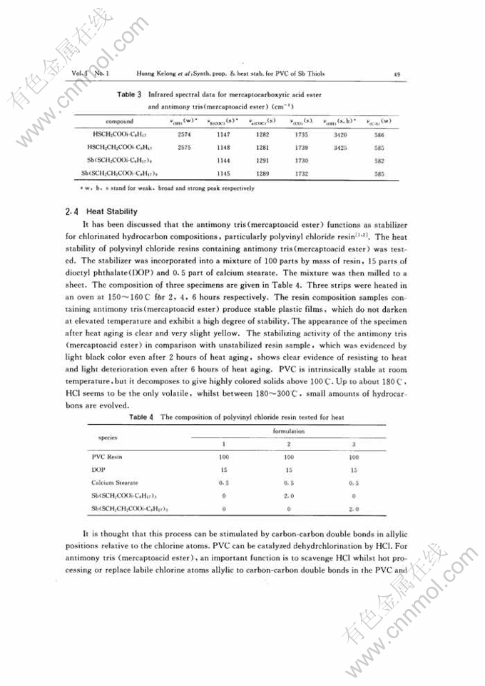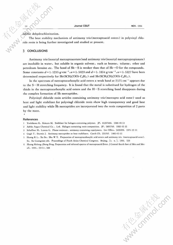 Abstract: Antimony mercaplde heat stabilizer for polyvinyl chlorideis synthesized from antimony trioxide and mercaptocarboxylic acid esters, HS(CH2).COOI-C8H17 (n=1~2) at 100~115 C In the presence of 0. 5%~1 % an organic acid catalyst. Some physicochemicalconstants of the compounds, such as density and refractive index, aredetermined. The complexes are hydrolabll in aqueous solutions andthe bond of Sb-S is weaker than that of Sb-o. The forming bondproperty of antimony tris (mercaptoacid ester ) has been elucidatedby measurement of infrared spectra in comparison with mercaptocarboxylic acid esters. The polyvinyl chloride resins containing antimony mercaptide heat stabilizers, do not darken at elevated temperatures and exhibit a high degree of stability. It is proposed that mercaptocarboxylic acid ester freeradicals can esterify PVC microradicals at carbon atoms with upaired electrons.