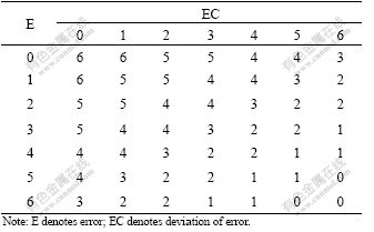 (3) Stretch Table 1 in accordance with the order from the top down and from left to right, and the united coding of the fuzzy rules shown in Table 1 was: 6655443, 6554432, 5544322, 5443221, 4432211, 4322110, 3221100, 6655443, 6554432, 5544322, 5443221, 4432211, 4322110, 3221100, where the anterior seven character strings were the fuzzy rules of Pc, and the after seven character strings were the fuzzy rules of Pm. The overall string represented an individual which included (7×7)×2=98 items of fuzzy rules.
