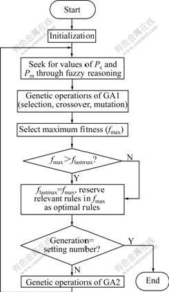The performance of genetic algorithm (GA), inspired by the concepts of natural selection and evolution, is obviously enslaved to the crossover probability Pc and mutation probability Pm [1-3]. For the values of Pc and Pm are invariable, there are problems as the low convergence rate and premature phenomenon in simple genetic algorithm (SGA) [4-6]. With view to solve these problems, adaptive genetic algorithm (AGA) was presented by SRINVIVAS and PATNIK [7], in which the values of Pc and Pm could be changed according to the fitness of the overall population. Though AGA has been proven to be able to obtain better performance than SGA for certain problems, it is inappropriate to adjust the control parameters Pc and Pm just according to the fixed rule. The rule to adjust Pc and Pm must be varied with optimization questions so as to find the optimal solution faster and more precisely. A great deal of studies show that there is much fuzzy information in tuning the values of Pc and Pm, thereby the fuzzy logic theory is used to adjust them [8-10].
