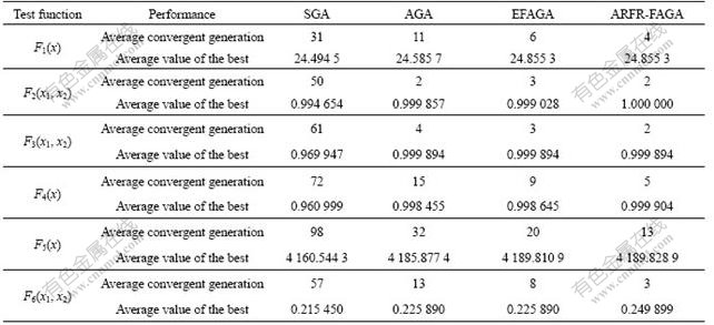 The ARFR-FAGA was compared with SGA, AGA and EFAGA in solving the function optimization problems when the other conditions of each algorithm were the same expect the values of Pc and Pm. The experiments were carried out using the following parameters: the overall population size was 80 individuals, the maximum generation number was 150, and the genetic operators were fitness proportional selection, one-point crossover and simple mutation. The values of Pc and Pm were fixed in SGA: Pc=0.6, Pm=0.001 and variable in AGA, EFAGA and ARFR-FAGA although their adjusting methods were different in the two algorithms. In AGA, Pc and Pm were determined by the following equations [7]: