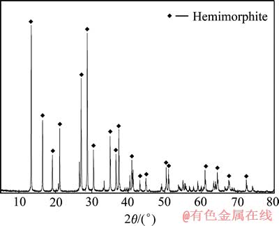 试验中使用的异极矿矿石取自云南省。矿石经过破碎,手选高结晶度、高纯度的异极矿矿块,使用铁锤锤碎至<3 mm,再用陶瓷球磨磨至小于74 μm占100%,然后经摇床多次分选得到异极矿样品。样品经标准筛筛分得到38~74 μm 粒级的产物,并用蒸馏水清洗3次,经真空干燥制成试验用样品。样品的X射线衍射分析结果如图1所示。由图1可见,样品中的氧化锌矿物为异极矿,无其他锌含氧盐矿物。经化学元素分析,样品中锌的质量分数为51.42%,异极矿纯度为95%,符合单矿物试验要求。