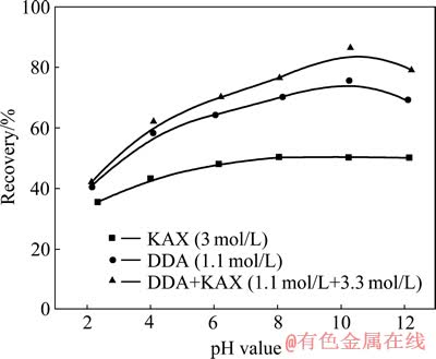 分别使用DDA、KAX以及混合药剂(摩尔比DDA:KAX=1:3,使用超声波振荡分散均匀的白色乳浊液[7])对异极矿进行浮选,结果见图2。