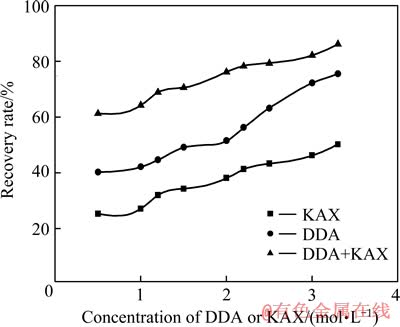 Fig. 3 Flotation recovery of hemimorphite as function of KAX or DDA concentrations in presence of KAX , DDA and mixed collector (KAX+DDA) including DDA of 1.1 mol/L and various KAX concentration at pH=11, respectively