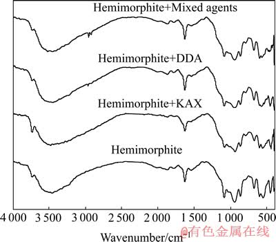 异极矿和KAX作用后的谱线与异极矿纯矿物的谱线相比,两者基本无变化,表明KAX在异极矿表面不能直接吸附。