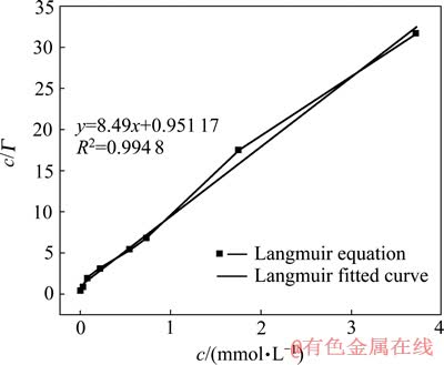 以c/Γ对c作图得到一条直线,拟合线性方程为图8。计算出KAX在异极矿表面的饱和吸附量Гs= 0.117 8 μmol/g。