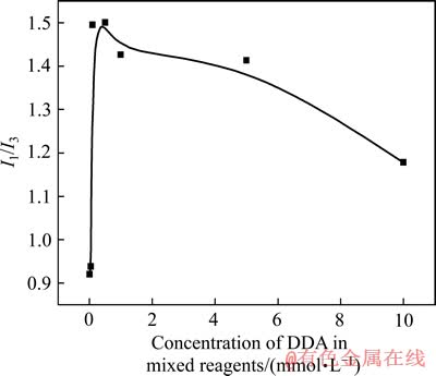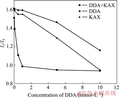 使用荧光光谱分析仪测出DDA、KAX以及混合药剂在不同浓度下的光谱图,再根据光谱图计算出微极性值(I1/I3)。微极性值(I1/I3)越小,荧光探针芘所在环境的非极性越强[21]。对于捕收剂溶液体系微极性值越小,则捕收剂的疏水性越强。图9所示为不同捕收剂的微极性随捕收剂浓度的变化关系(图中KAX浓度是对应的DDA浓度的3倍)。