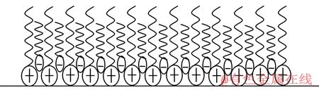 根据红外光谱以及荧光探针检测的结果可知,DDA和KAX的混合药剂比单用DDA的效果要好。推测其主要原因是二者带有不同电性,十二胺阳离子和黄药阴离子的交互作用降低了十二胺的临界胶束浓度,使得混合捕收剂在异极矿表面更易形成半胶束吸附。提出混合捕收剂在异极矿表面的吸附模型如图12所示,黄药阴离子穿插在十二胺阳离子之间,因为正负电荷的相互作用,降低了十二胺阳离子之间的静电斥力,使十二胺阳离子能够更容易形成胶束[17],也更容易在异极矿表面吸附,从而使异极矿表面疏水上浮。