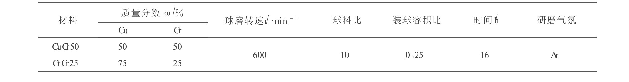 实验所用的原料为国产-300目电解铜粉 (纯度>99.95%) 及-200目铬粉 (纯度>99.17%) 。 将铜粉、 铬粉及液体保护介质按一定比例装入自制的高能球磨机中进行机械合金化。 高能球磨机筒体为不锈钢, 磨球为Φ 6 mm的轴承钢球, 搅拌轴转速用可控硅无级调速控制, 合金成分及球磨参数如表1所示。