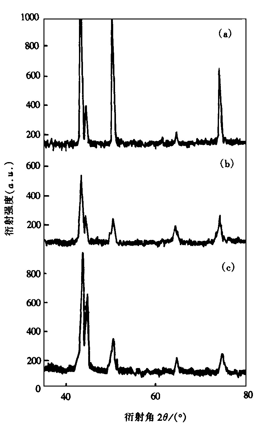 图1 (a) 、 (b) 分别为Cu50-Cr50原始粉及机械合金化后的X射线衍射图, 可以看到, 球磨后衍射峰宽化, 衍射强度减弱, 部分衍射峰消失。 这正是晶粒细化及铜与铬互相固溶的结果。 利用谢乐公式