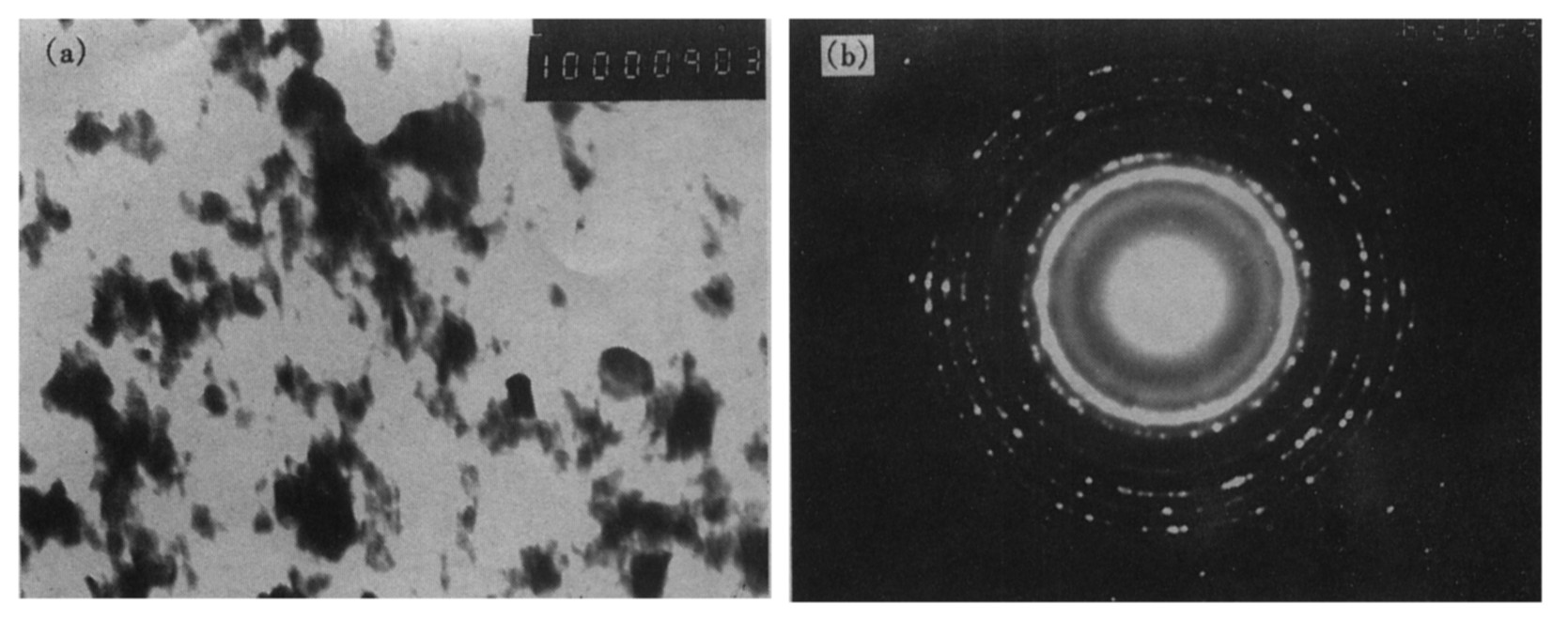 (a) 组织形貌 (×100000) ; (b) 衍射花样