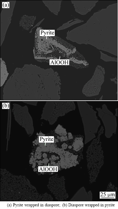 Fig. 1 SEM images showing relationship between pyrite and diaspore in high-sulfur bauxite