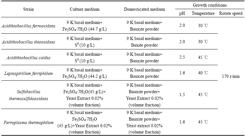 本实验所用6种嗜酸微生物——嗜酸氧化亚铁硫杆菌(Acidthiobacillus ferrooxidans)、嗜酸氧化硫硫杆菌(Acidthiobacillus thiooxidans)、嗜铁钩端螺旋菌(Leptospirillum ferriphilum)、嗜酸喜温硫杆菌(Acidithiobacillus caldus)、嗜温硫氧化硫化杆菌(Sulfobacillus thermosulfidooxidans)、铁质菌(Ferroplasma thermophilum),均来自生物冶金教育部重点实验室菌种保藏中心。在脱硫实验之前,6种嗜酸微生物以升华硫和硫酸亚铁为能源进行活化,然后以目标铝土矿为能源,逐渐增加矿浆浓度,在5%、10%、15%、20%浓度下进行驯化培养。