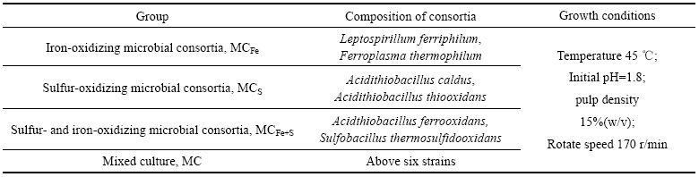 根据微生物的代谢特性[12],两两等比接种,构建了表5所列的亚铁氧化菌群MCFe、硫氧化菌群MCS、铁硫氧化菌群MCFe+S。另外,将组成3组菌群的6种菌等比混合,形成包含6株菌的菌群MC。共培养体系设为150 mL,初始pH=1.8,矿浆浓度15%,摇床转速170 r/min,接种后体系微生物浓度为5.0×106 mL-1,在恒温摇床内震荡培养。为便于比较,温度设为45 ℃,比Acidthiobacillus ferrooxidans的最佳生长温度略高。