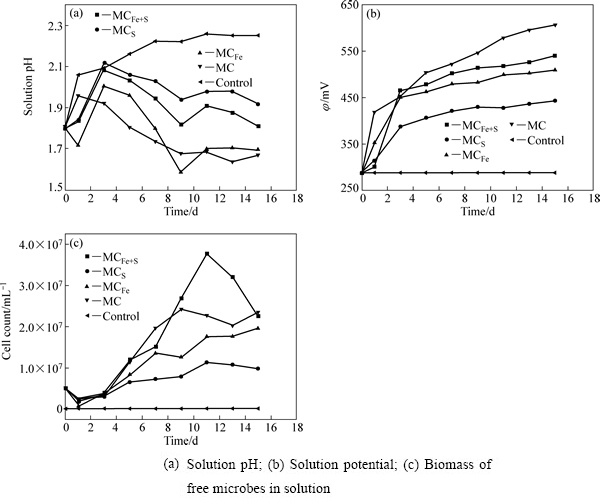 pH、φ、细菌数量等变化趋势如图3所示。各组pH[19]总的趋势为先上升后下降,而酸浸对照的趋势则是一直上升。pH的变化与铝土矿中碱性脉石矿物耗酸直接相关。微生物的氧化产酸和碱性脉石耗酸彼此消长,由于主要含硫矿物黄铁矿的在铝土矿中的相对含量较低,各组pH维持在1.7~2.1之间,较为适宜菌群的生长,生物量在脱硫过程中都保持着上升的趋势。φ直接与[Fe3+]/[Fe2+]成正相关[19],微生物不断将Fe2+ 氧化成Fe3+,使脱硫体系中Fe3+的浓度逐步上升,φ在脱硫过程中逐步升高,前3 d各组电位升速较快,第3~9 d内电位增速下降,第9 d后除MC之外,电位逐渐维持在一个较小的区间内,MCS的φ维持在440 mV左右,MCFe的φ维持在500 mV左右,而MCFe+S的φ则维持在520 mV左右。而在酸浸对照组实验中,由于没有微生物将Fe2+ 氧化为Fe3+,φ几乎没有上升,保持在300 mV以下。