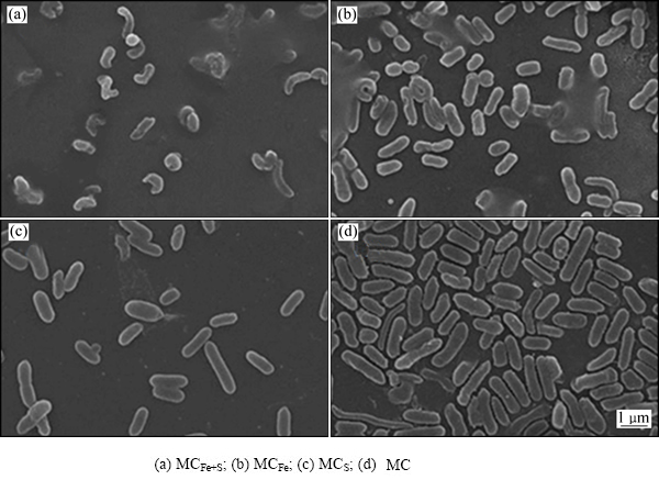 、D. Kock发现Acidthiobacillus ferrooxidans吸附在纯黄铁矿表面的速度很快,30 min就可以达到最大吸附量,在90 min 左右就可达到吸附的临时平衡点[16]。GU等[25]发现Acidthiobacillus ferrooxidans在吸附时优先吸附在黄铁矿表面有晶体缺陷和断裂面原子密度较低的位置。BLIGHT[26]对Acidthiobacillus ferrooxidans氧化黄铁矿及浸出后的显微结构进行了研究,扫描电镜显示,浸出后的黄铁矿表面有广泛分布的蚀坑,刮下的浸渣中有黄钾铁矾,除渣后矿物表面有零星的微生物,可见细菌始终与矿物表面接触,认为细菌通过直接机理氧化黄铁矿。MCFe+S的数量高于MCFe和MCS,φ从289 mV上升到450 mV仅用了2 d的时间,之后电位维持在450~550 mV之间,pH维持在1.8左右。在酸性无菌条件下,对纯黄铁矿化学氧化的电化学研究发现,在450~600 mV(vs SCE)电位区间内,硫单质、缺铁硫化物(Fe1-xS2)和多硫化物(FeSn)等中间产物[27]覆盖在矿物表面,阻碍了黄铁矿的进一步氧化溶解,黄铁矿钝化。Acidthiobacillus ferrooxidans和Sulfobacillus thermosulfidooxidans均可消解覆盖在黄铁矿表面的氧化中间产物,促进黄铁矿的进一步溶解。因此在脱硫率方面表现出比MCFe和MCS更强的氧化能力,经15 d 氧化后,铝土矿中硫含量下降到0.49%,脱硫率为62.60%。在MCFe+S脱硫的过程中,既存在直接作用,又存在间接作用。