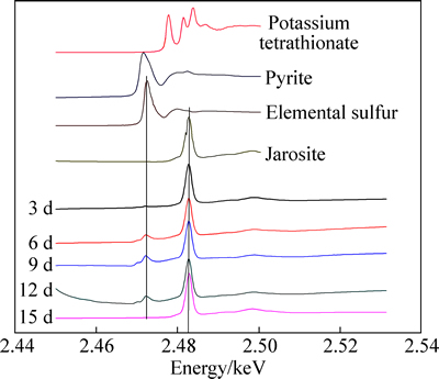 XANES结果显示:在脱硫第3 d时,就在2.482 keV处出现明显的峰,经与参比化合物对比,确定为黄钾铁矾的峰。之后4次检测中均出现此峰。黄钾铁矾是生物氧化过程中常见的产物,其生成如反应式(12)所示[34],M为一价阳离子,如Na+,K+,NH4+。