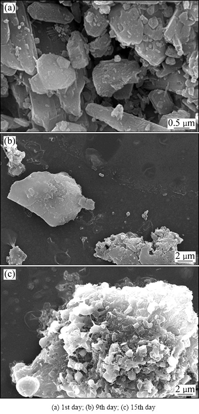 Fig. 6 SEM images of high sulfur bauxite surface during desulfurization processing with moderately thermophilic consortia MC