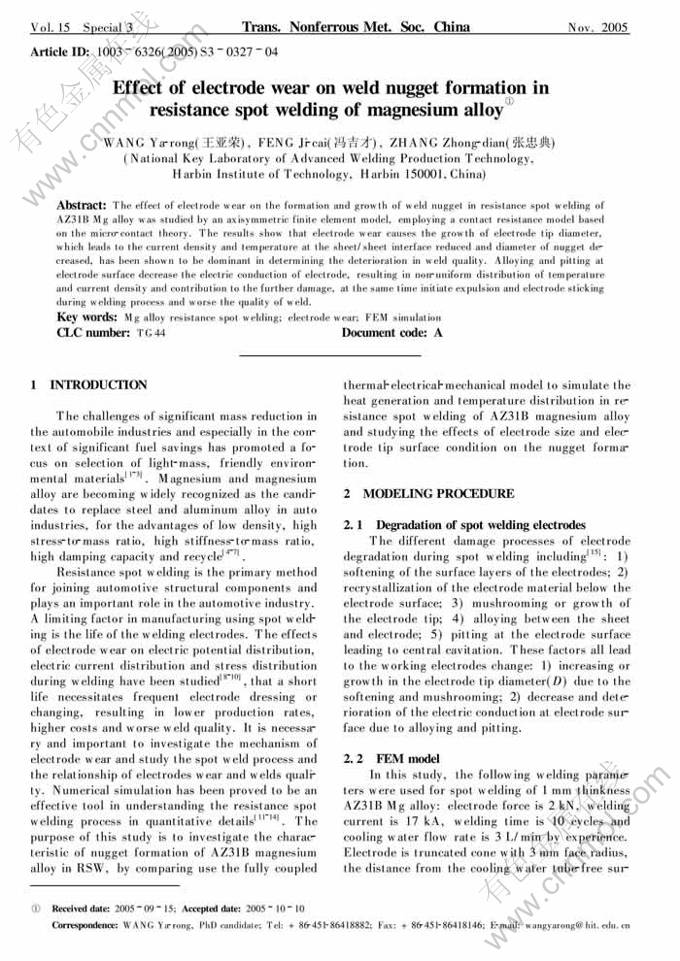 Key words:Mg alloy resistance spot welding; electrode wear; FEM simulation