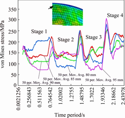 Figures 3 and 4 present the von Mises stress history of two selected elements: one in the vicinity of blank holder and the other close to the edge of flange as indicated in the corresponding insets. There are four segments, each representing a stage, in each of the two shown history curves. Each segment consists of a peak followed by either a horizontal or an inclined curve. This follows that the deformation stress in each stage initially rises to a certain magnitude and subsequently settles down to lower value once the tool has fully evolved into the sheet.