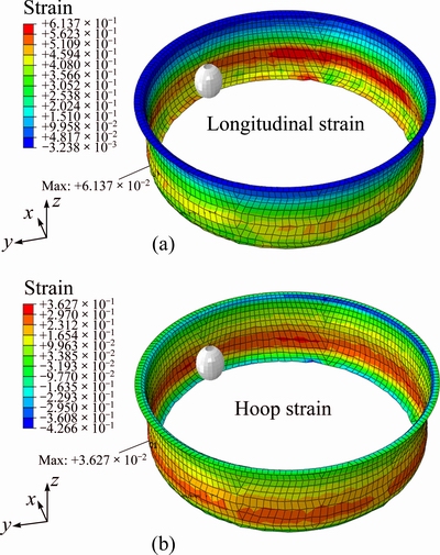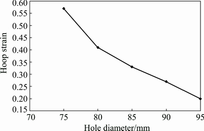 Figure 7 portrays the distribution of in-plane strains on a representative cylindrical flange. It is observed that the maximum straining occurs nearby the flange edge. Moreover, in agreement with the interesting experimental finding reported in Ref. [14], deformation besides longitudinal strains also takes place due to hoop strains despite the size of blank was kept large to prevent tool/sheet contact in the hoop direction. In fact, the free material around the pre-cut hole bends around the tool during forming thus in turn increasing the tool/sheet contact in the hoop direction and hence causing the development of hoop strains. As shown schematically in Fig. 8, the hoop contact reduces with the increasing of hole size. As a result, the hoop strains also decrease as depicted in Fig. 9. This points out that the development of hoop strains could affect the thickness distribution in the flange wall.