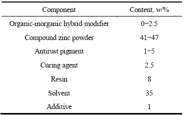 本文作者前期以含强极性基团的双组份三元共聚树脂为成膜物,匹配复合锌粉、防锈颜料,添加有机-无机杂化改性剂,制备在锌防护层、Q235(St3)及Q235(St2)基材上防护性能优异的锌防护层修复涂料。在此,本文作者研究涂料组分(复合锌粉、有机-无机杂化改性剂)对涂层防护性能的影响,并与同类进口产品对比分析,为高性能锌防护层修复涂料的应用奠定了基础。