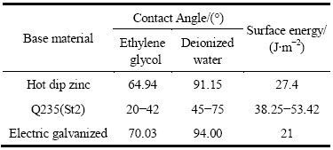以去离子水、乙二醇为探测液体,测得两种液体在3种基材上的接触角代入热力学方程(2)和(3),解得涂装前3种基材的表面能[19]如表3所列。