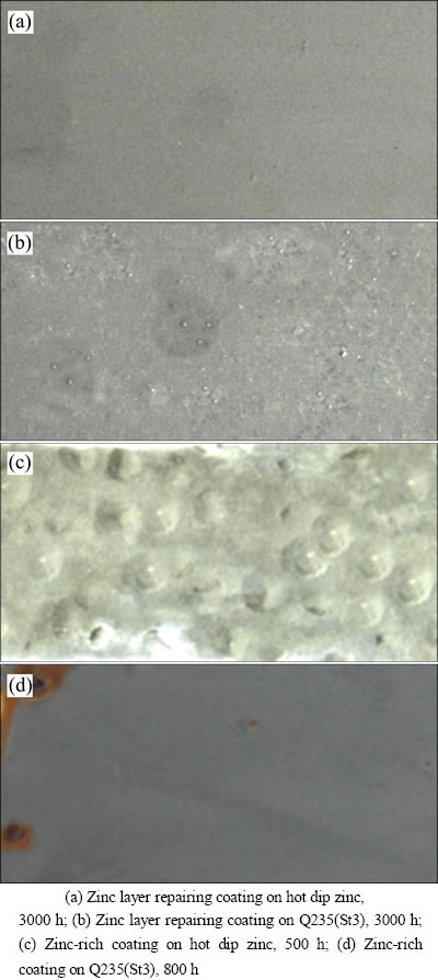 Q235(St3)及热浸锌表面锌防护层修复涂层(厚度为(150±20) μm)及同类进口涂层(厚度为(150±20) μm)中性盐雾试验后的宏观形貌如图8所示。由图8可看出,经3000 h中性盐雾试验后,Q235(St3)和热浸锌上的锌防护层修复涂层仅出现轻微起泡;经500 h中性盐雾试验后,热浸锌上某进口富锌涂层已大面积起泡;经800 h中性盐雾试验后,Q235(St3)上某进口富锌涂层出现起泡及锈蚀。