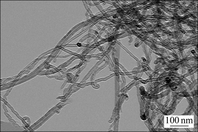 多壁碳纳米管(CNTs)因独特的空心管状结构和高比表面积而具有大的储氢能力。同时,CNTs在强碱性溶液中有较强的抗腐蚀和抗氧化性能,还具有良好的导电性能,这些优点决定了CNTs是储氢合金电极理想的添加剂。近年来,为改善储氢合金电极的储氢性能,研究者将CNTs添加到合金电极中进行了研究。黄辉等[17]将采用化学沉积法制备的CNTs作为电极添加剂直接与MmMn0.4Co0.7Al0.3Ni3.4合金混合制备了储氢合金电极。研究表明,CNTs的加入可以提高合金电极的放电容量和初始活化性能,也能明显改善合金电极的放电平台和高倍率性能。考虑到采用不同的制备方法、不同的纯化处理方法得到不同管径的碳纳米管,其电化学储氢容量有很大的差别。易双萍等[18]将纯化后的CNTs在氮气下进行热处理,研究不同热处理温度对CNTs-LaNi5电极电化学性能的影响。研究结果表明,CNTs热处理后,管壁变薄,层数变少,管的外径减小,更有利于氢气的吸附和脱附;800 ℃时,CNTs-LaNi5电极的储氢性能最好。