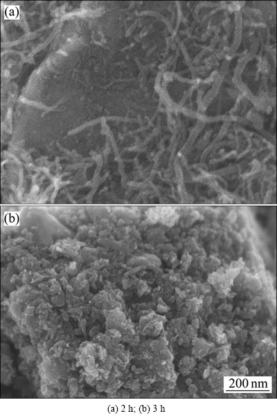 图2所示为球磨2 h和3 h后CNTs的SEM像。与图1对比可见,未球磨时,细长的CNTs无规则盘绕在一起,管状结构清晰可见,管子长且断口少。球磨2 h后,细长的CNTs断裂,长度明显变短,出现许多翘起的断头。随球磨时间的进一步延长,CNTs空心管状结构逐渐破损,形成与CNTs团聚在一起的无定形碳颗粒。