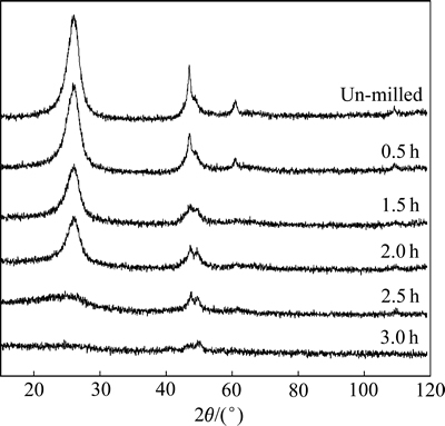 Fig. 3 XRD patterns of CNTs ball-milled for different milling time