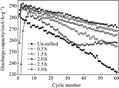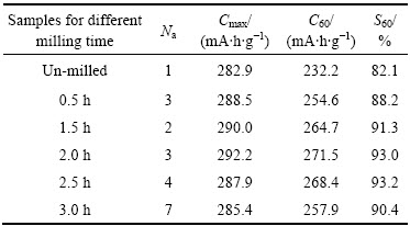 2) 与添加未球磨CNTs的合金电极相比,添加球磨后CNTs的合金电极的最大放电容量、放电特性以及循环稳定性均有所改善。随球磨时间的延长,合金电极的最大放电容量、放电性能及循环稳定性均呈现出先提高后减弱的变化规律。当球磨时间为2 h时,合金电极的最大放电容量达到最大值,为292.2 mA·h/g,且此时合金电极具有最佳的放电性能。当球磨时间为2.5 h时,合金电极的循环稳定性最好,经60次充放电循环后的容量保持率为93.2%。