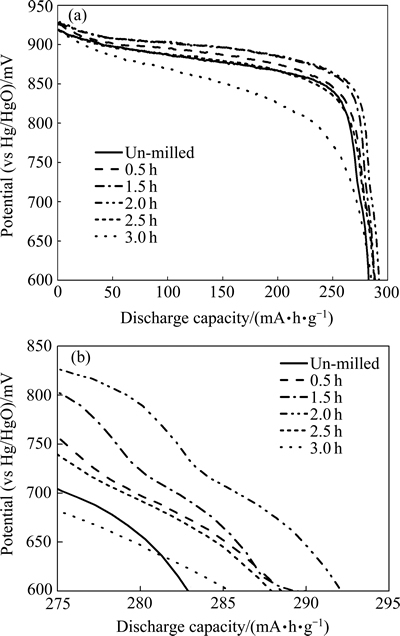 图5所示为添加未球磨和球磨CNTs的AB5型储氢合金电极的放电平台特性曲线。