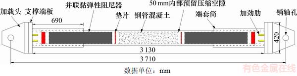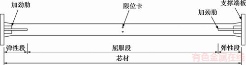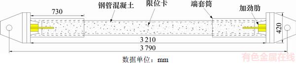 试验共设计了复合消能支撑及防屈曲支撑试件各1根。其中,防屈曲支撑试件约束构件为钢管混凝土,作为复合消能支撑试件性能试验的对照组。2根试件端部均焊在支撑端板,再通过对拉螺栓与加载头端板连接,试验加载设备与试件加载头最后通过销轴连接。